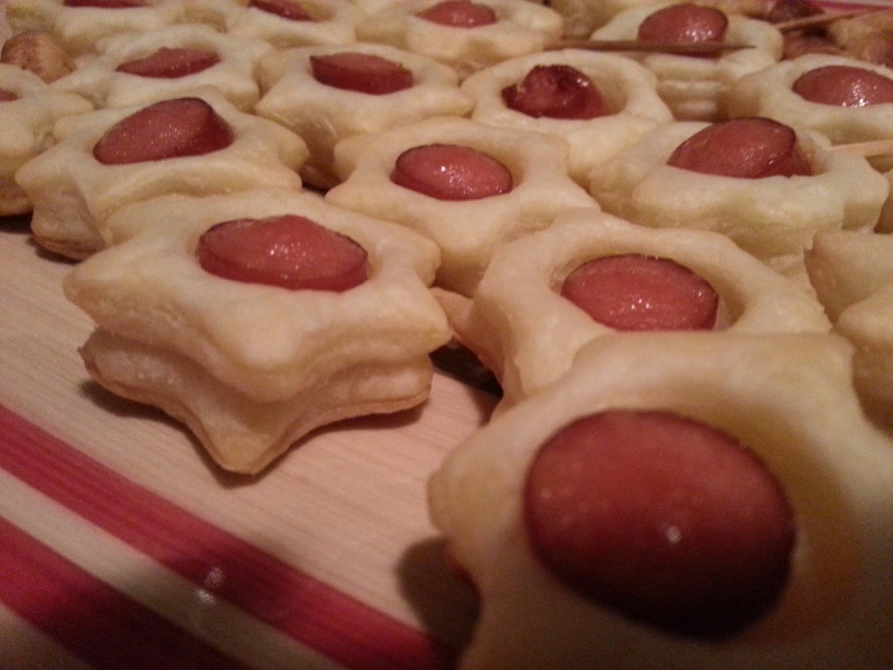 Placer au milieu de chaque fleur un petit bout de saucisse et enfourner la plaque recouverte de papier sulfurisé à 180° environ 20 minutes (la durée et la température de cuisson dépendent de votre four ; il faut donc les adapter)